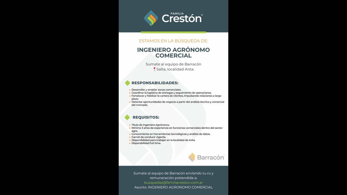 - Mínimo 3 años de experiencia en funciones comerciales dentro del sector agro.
